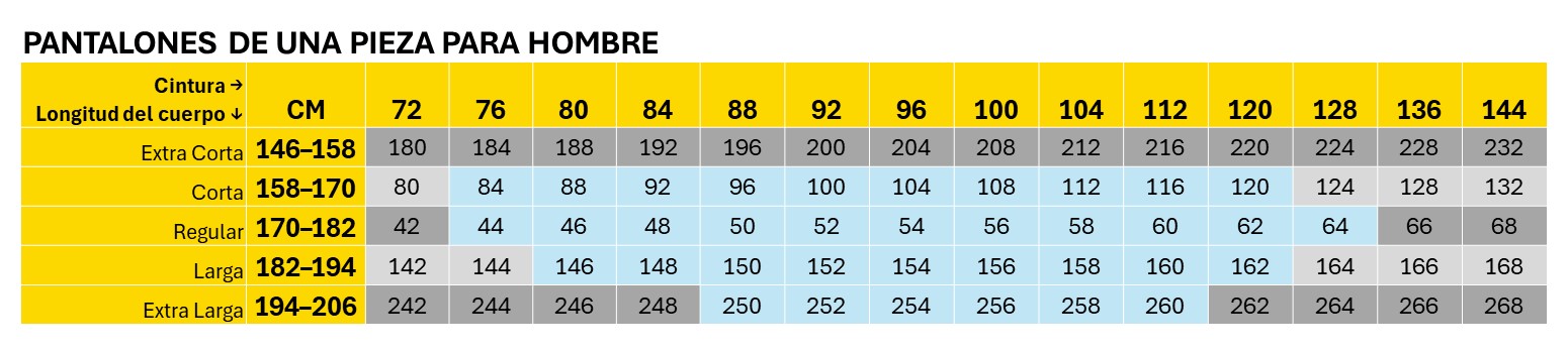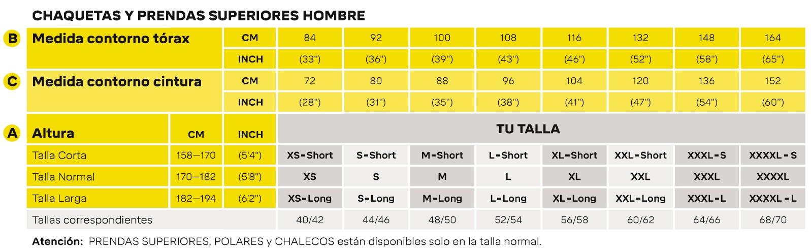 Las chaquetas, sudaderas y monos se miden según pecho y altura corporal, con tallas desde XS a XXXXL, disponibles en versiones Corta, Estándar o Larga.