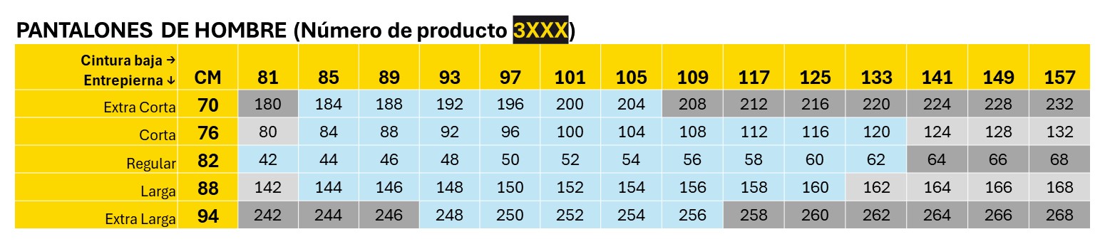 - Un pantalón talla 50 Estándar se adapta a una altura entre 170–182 cm y una cintura de 88–92 cm.