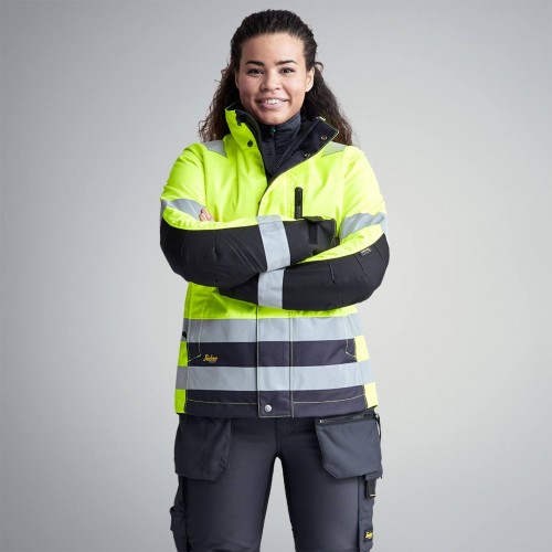 Chaqueta aislante de alta visibilidad para mujer diseñada para todo tipo de trabajo en invierno, cuando hace frío y llueve. La certificación de clase 3 según la norma EN 20471 garantiza una visibilidad óptima para una mayor seguridad.