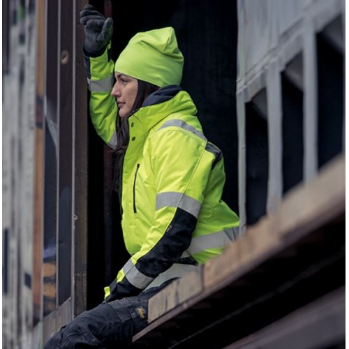 Chaqueta aislante de alta visibilidad para mujer diseñada para todo tipo de trabajo en invierno, cuando hace frío y llueve. La certificación de clase 3 según la norma EN 20471 garantiza una visibilidad óptima para una mayor seguridad.