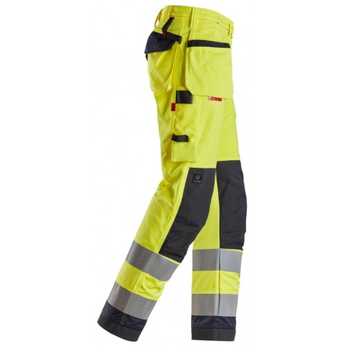 Pantalones de trabajo de protección personal con bolsillos flotantes y bolsillos en las perneras. Estos pantalones ofrecen visibilidad de Clase 2, así como protección contra el calor y las llamas, arco eléctrico y antiestático para la seguridad en áreas de trabajo de alto riesgo y entornos peligrosos.