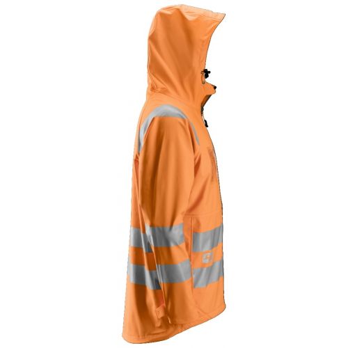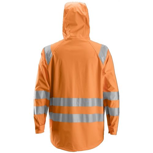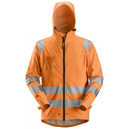 Un faro en la lluvia. Chaqueta totalmente impermeable de alta visibilidad. Fabricada en poliuretano elástico con costuras selladas para garantizar un día de trabajo 100% seco y cómodo. EN 343, EN 471, Clase 3.