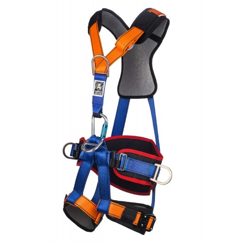 Confeccionado con cintas de poliéster de 45 mm de ancho. Este equipo cuenta con un cinturón de sujeción incorporado al arnés, diseñado con un sistema de acolchado para optimizar el confort del usuario. Igualmente dispone de hombreras y perneras acolchadas regulables para garantizar la comodidad en operaciones de suspensión y asiento. Dispone de dos puntos de enganche anticaídas, uno en la zona dorsal y otro en la zona pectoral formados por anillas de acero. Cuenta también con dos puntos de enganche de sujeción a ambos lados del cinturón formados por anillas planas de acero. Asimismo, dispone de un enganche de suspensión en la zona abdominal formado por una anilla de aluminio para operaciones prolongadas de suspensión y asiento. Las hombreras y el cinturón son regulables mediante dispositivos fabricados en aluminio. Las perneras son regulables y pueden abrirse mediante hebillas de cierre automático de acero.