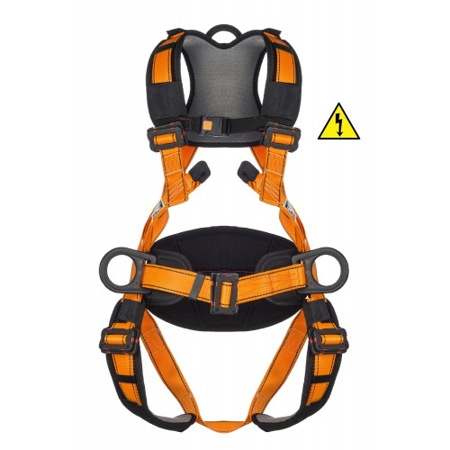 Arnés anticaídas dieléctrico según norma EN361:2002 con cinturón de sujeción dieléctrico según norma EN358:2018. Dispone de dos puntos de enganche anticaídas, uno dorsal en forma de anilla con recubrimiento aislante de nylon y otro pectoral en forma de gazas textiles. El cinturón cuenta con dos anillas laterales de sujeción fabricadas con recubrimiento aislante de nylon. Dispositivos de regulación y cierre fabricados con recubrimiento aislante de nylon.