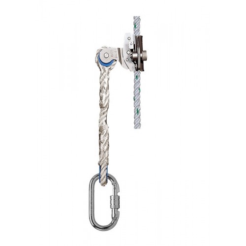 Dispositivo anticaídas móvil sobre cuerda de poliamida 14 mm de diámetro, con sistema de frenado automático. El dispositivo está fabricado en acero galvanizado en su totalidad. El tramo de cuerda de amarre es de poliamida con terminaciones en forma de gaza injerida y protectores transparentes. Sus terminaciones están provistas de guardacabo.