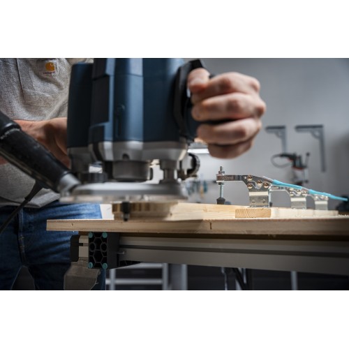 El dispositivo de sujeción rápida móvil de acero es ideal para todos los proyectos en los que desee sujetar y mecanizar piezas de forma segura. Con la placa adaptadora de fundición de aluminio, se puede fijar en unos segundos en cualquier mesa que tenga perforaciones de 20 mm. Basta con insertarlo y apretar el tornillo de conexión situado bajo la mesa de trabajo. Gracias al asa ergonómica se puede hacer de forma rápida, segura y cómoda. Sujetando de esta forma, puede aplicar una fuerza de sujeción de hasta 150 kg con esta herramienta. El dispositivo de sujeción rápida móvil es ideal para realizar trabajos en serie. Alternativamente, también puede retirar la placa adaptadora y atornillar de forma permanente el dispositivo de sujeción rápida móvil con cuatro tornillos directamente a la mesa de trabajo. Mediante el husillo roscado es posible ajustar de forma flexible la anchura de sujeción entre 0 y 38 mm. Con un rango de alcance de 25 a 65 mm es ideal para el uso versátil en distintas tareas de sujeción. El manejo se realiza con la palanca de sujeción, que está recubierta de goma sin PVC para un agarre óptimo. El tope está fabricado en NBR (caucho) de alta calidad para sujetar la pieza de trabajo sin deslizamiento y cuidando la superficie.