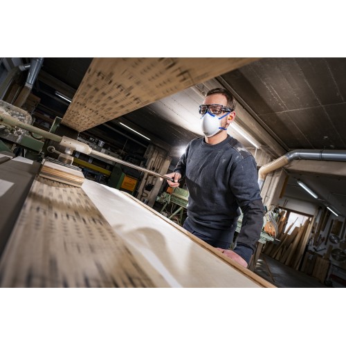 La máscara de protección respiratoria de la clase de filtrado FFP2 con diseño rígido protege de forma fiable frente al polvo y los aerosoles nocivos para la salud, y es ideal para trabajos de lijado, cepillado y aislamiento. La clase de protección está dimensionada para filtrar el 94 % de las partículas hasta un tamaño de 0,6 μm y para un uso seguro en el lugar de trabajo hasta un valor 10 veces mayor que el límite de exposición profesional. La máscara de protección respiratoria es un producto desechable que se puede utilizar durante un turno de trabajo. El tejido filtrante suave es muy agradable al tacto y ofrece un cierre óptimo a lo largo del contorno de la cara. La pieza para la nariz es flexible, lo que permite ajustarla para una mayor comodidad. Gracias a la innovadora tecnología de filtrado, la resistencia a la respiración es mínima. La máscara de protección respiratoria cumple el reglamento relativo a los equipos de protección individual (UE) 2016/425. Cumple las condiciones especiales de la prueba de retención de polvo de dolomita y ofrece seguridad con la calidad controlada según la norma EN 149:2001 + A1:2009. Tenga en cuenta las indicaciones de seguridad y manejo.