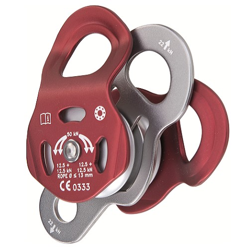 Polea oscilante de aluminio de doble roldana para cuerdas de 8 a 13 mm de diámetro según norma EN 12278:2007.