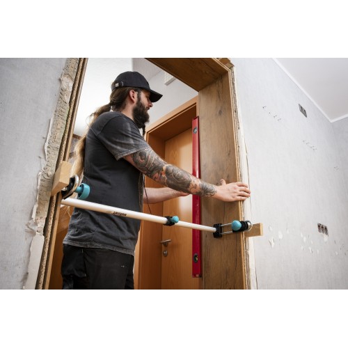 Con un potencial de ahorro de aproximadamente 45-70 euros por puerta interior, el autoensamblaje es un interesante proyecto de bricolaje que puede realizar sin esfuerzo y sin problemas con el puntal de ensamblaje para cerco de puerta EASY. La principal ventaja de este elemento inteligente es que puede fijarlo directamente al marco horizontal. De esta manera, permanece fijo y no se cae cuando el marco se monta y se alinea. Fijado a las piezas laterales, el puntal de montaje Easy también bloquea, sostiene y protege el marco durante el transporte y la inserción. Este dispositivo de sujeción también ayuda a la alineación vertical y horizontal. Por ello, puede ahorrarse el complicado ajuste con soportes de madera o cuñas. El puntal de montaje EASY es adecuado para todas las puertas de medidas habituales de 610/735/860/985 mm.