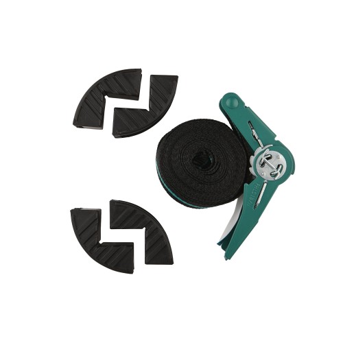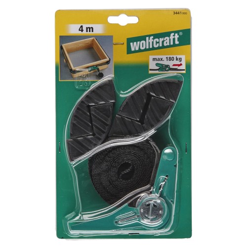 En la correa hay cuatro mordazas de sujeción de plástico con alojamiento de 90° que se pueden desplazar y con las que es posible fijar piezas de manera segura piezas rectangulares y distribuir la fuerza de tracción con uniformidad. Además, se puede aplicar una gran fuerza de tracción de hasta 180 kg, lo que convierte al tensor de cinta con carraca en la herramienta ideal también para trabajos de encolado. Si se desea utilizar el tensor de cinta de carraca como correa de sujeción, basta con retirar las mordazas de sujeción.